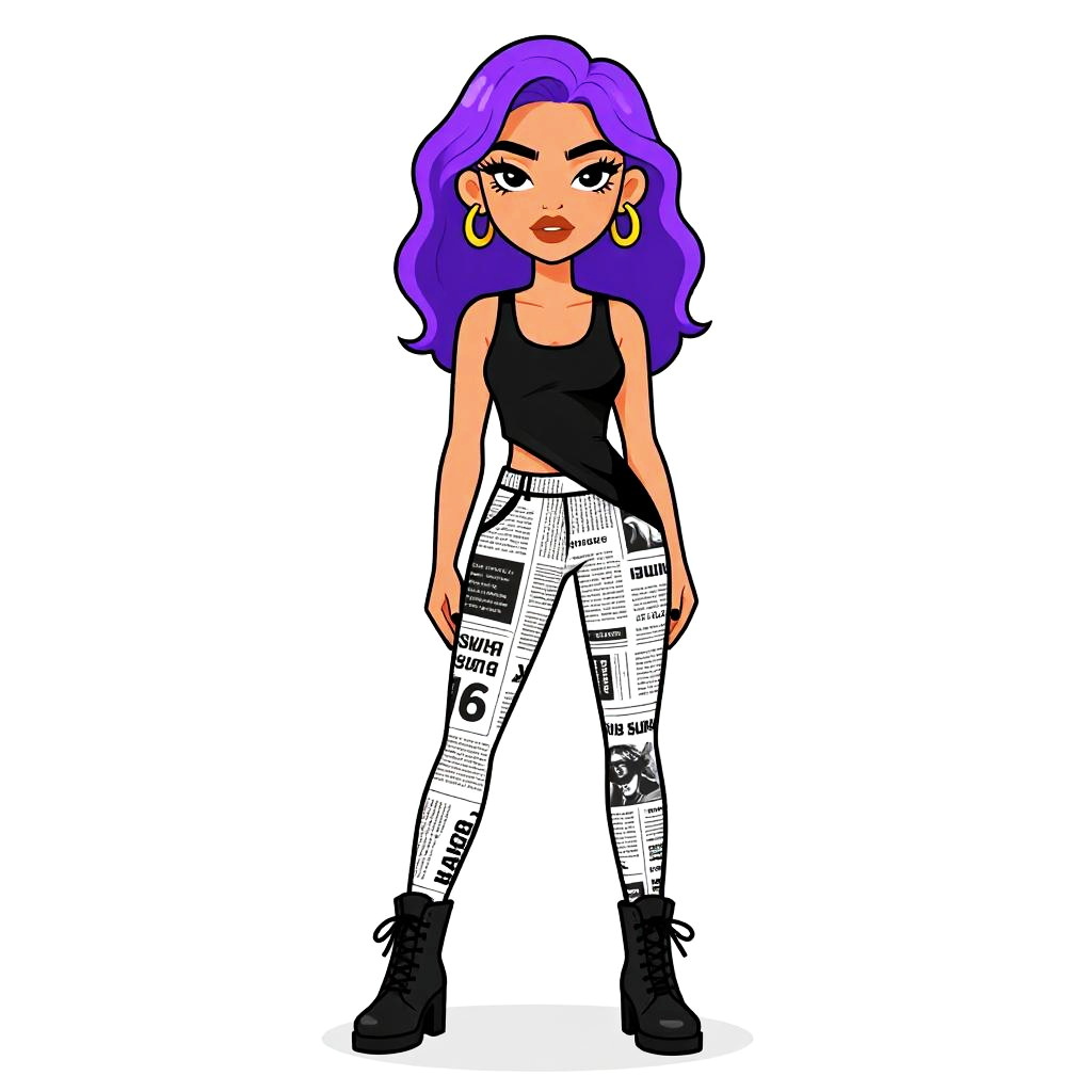 Illustration of a young woman with vibrant purple hair wearing urban streetwear. She has a black tank top with an asymmetrical hem paired with monochrome newspaper print leggings. The outfit is completed with black high-top ankle boots featuring chunky heels and multiple straps. The background is plain white.