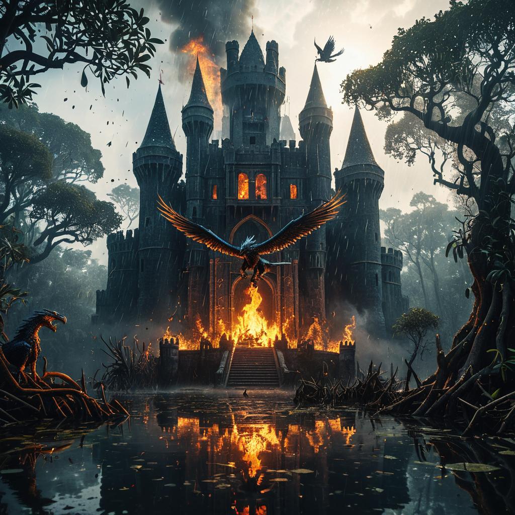 Burning Medieval Castle with Fiery Pegasus