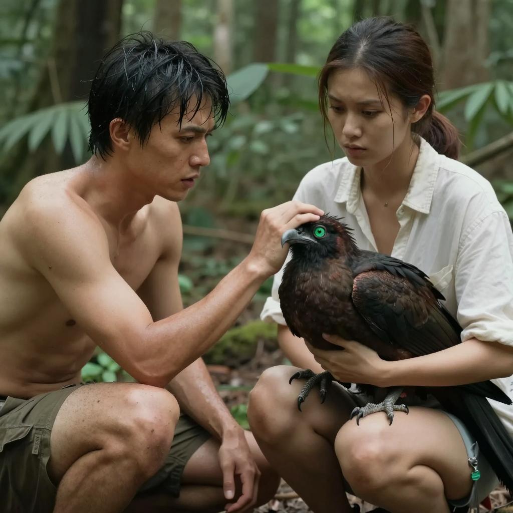 Four people stand outdoors in a forest. Shirtless man with dark hair and feathered headpiece on the right. Woman in pink shirt on the left, woman in striped shirt in the middle, man in green shirt in background. Sunlight filters through trees. Woman in striped shirt has curly hair. Man in feathered headpiece looks to the side. Woman in pink shirt looks to the left.