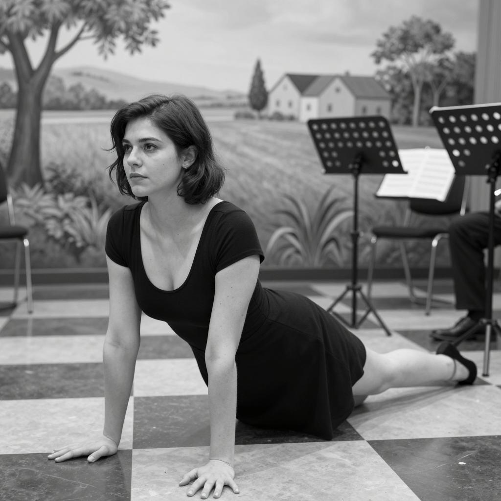 Two women lying on dark floor, arms extended. Woman on left, red hair, blue shirt, hand outstretched. Woman on right, black tank top, patterned skirt, wooden pole, bracelet. Both looking down, intense expressions. Dark, confined space.