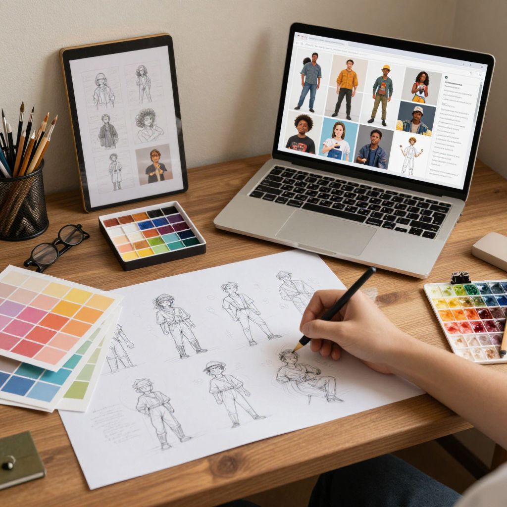 Clothes description generator visualization, a creative AI model analyzing diverse fabrics and fashion styles, generating creative descriptions, surrounded by fashion sketches and detailed texture patterns, bright and engaging digital workspace
