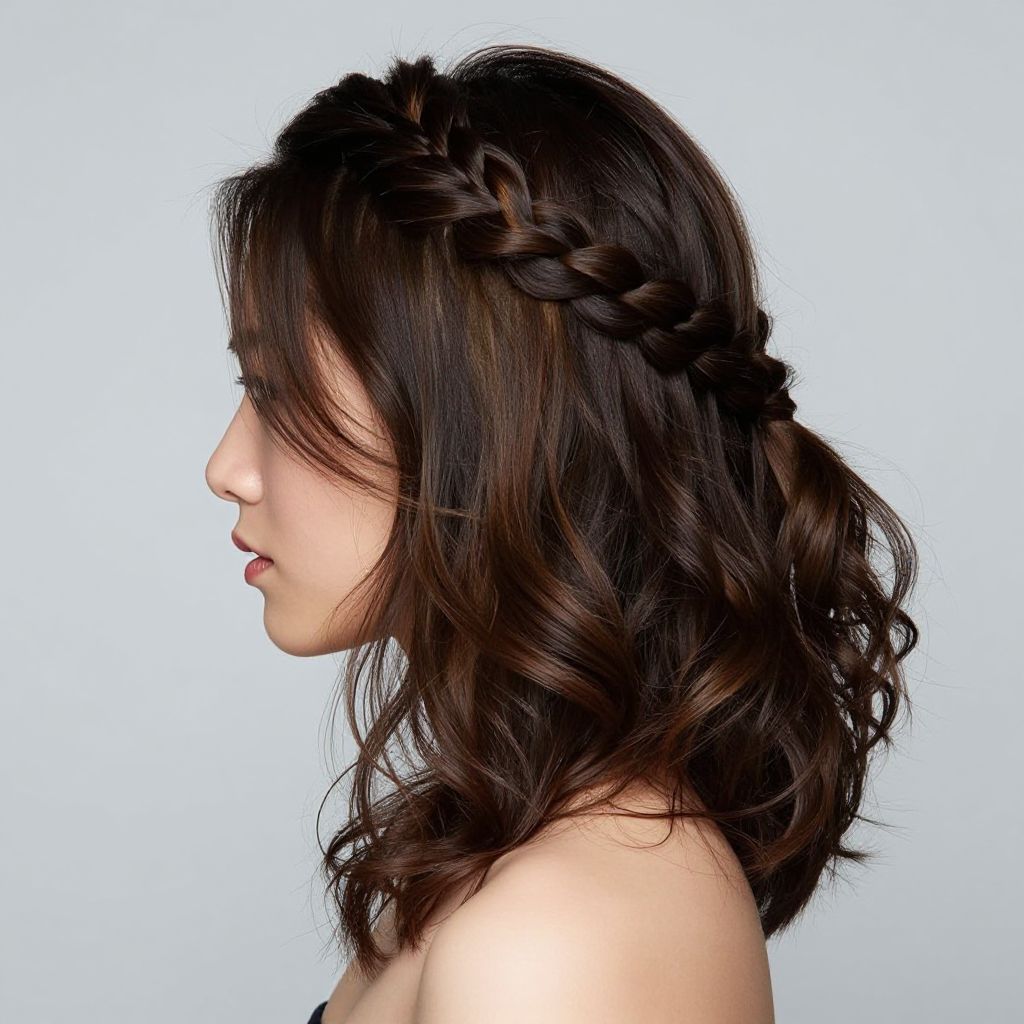 Side profile photograph of an Asian woman with wavy, dark brown hair featuring a braided crown, against a plain white background.