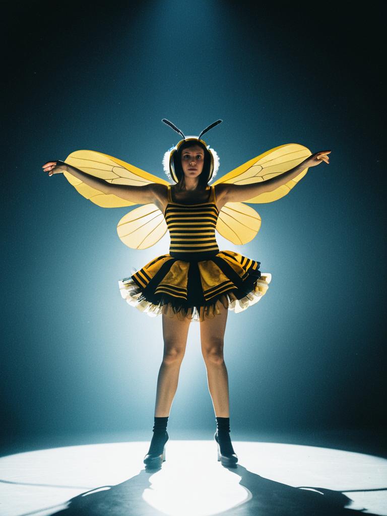Woman in Bee Dance Costume, full-body editorial photo in bright stage lighting