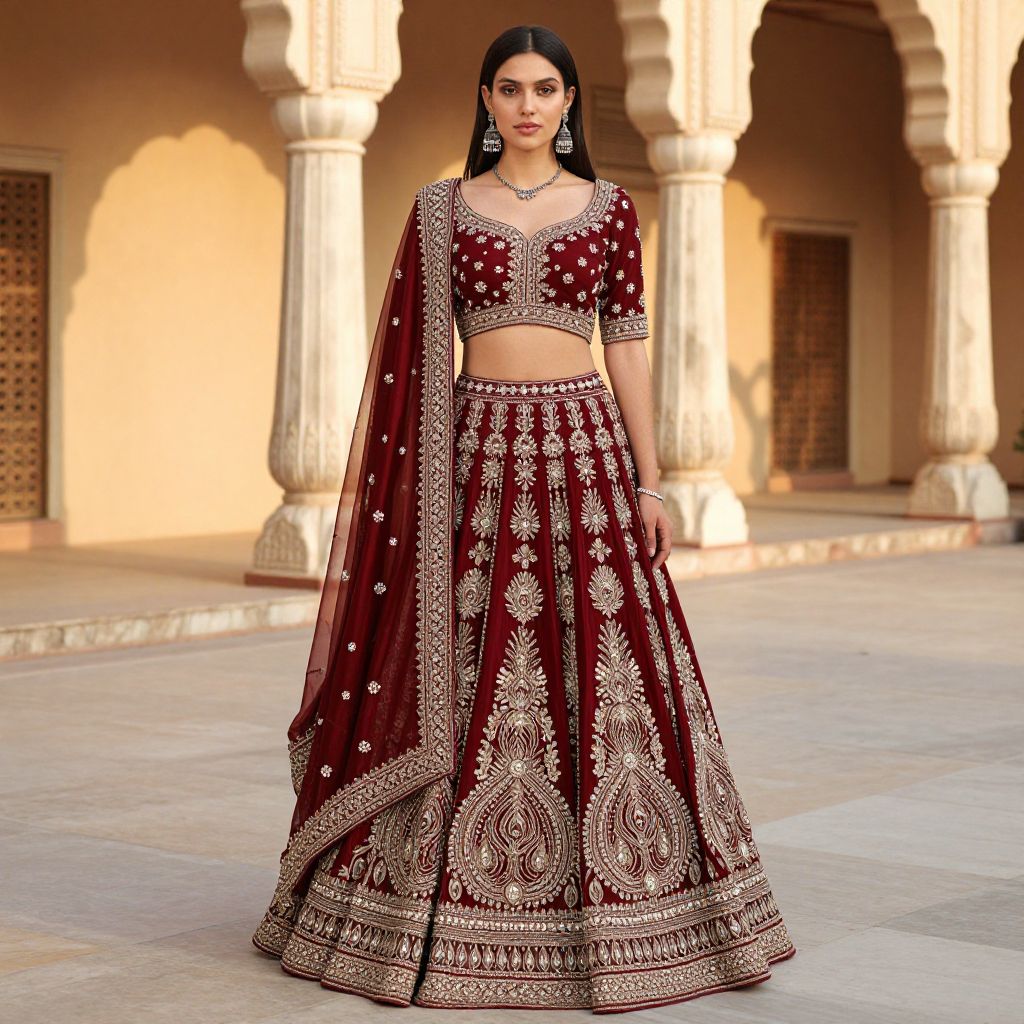 A model with soft almond-shaped eyes and a graceful, oval face poses in a regal palace courtyard, wearing a richly designed lehenga with a deep crimson base, intricate silver embroidery, and a wide, structured border, the costume is detailed with peacock feather patterns and beading, under soft golden hour lighting with marble pillars in the background