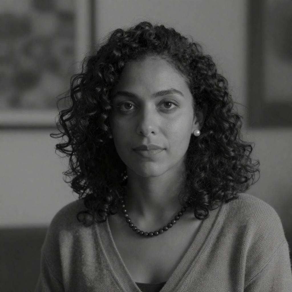 Black-and-white close-up portrait of a woman with curly dark hair, wearing a knitted cardigan, pearl earrings, and a dark beaded necklace. She is looking directly at the camera with a neutral expression against a softly blurred indoor background featuring patterned elements.