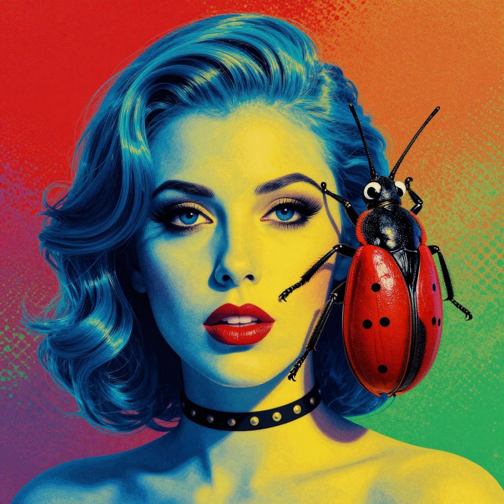 The image is a vibrant pop art-style composition featuring a woman and a bug. The woman's face is split into two halves, with one side in a cool blue hue and the other in a warm yellow-green. Her hair is styled in soft waves, and she wears a black choker. To her right, a large red and black bug with prominent eyes and antennae is perched, adding a surreal touch to the scene. The background is a textured, gradient mix of red and green, enhancing the dynamic and bold nature of the artwork. The composition is balanced, with the woman's face and the bug positioned in the center, creating a harmonious visual narrative.