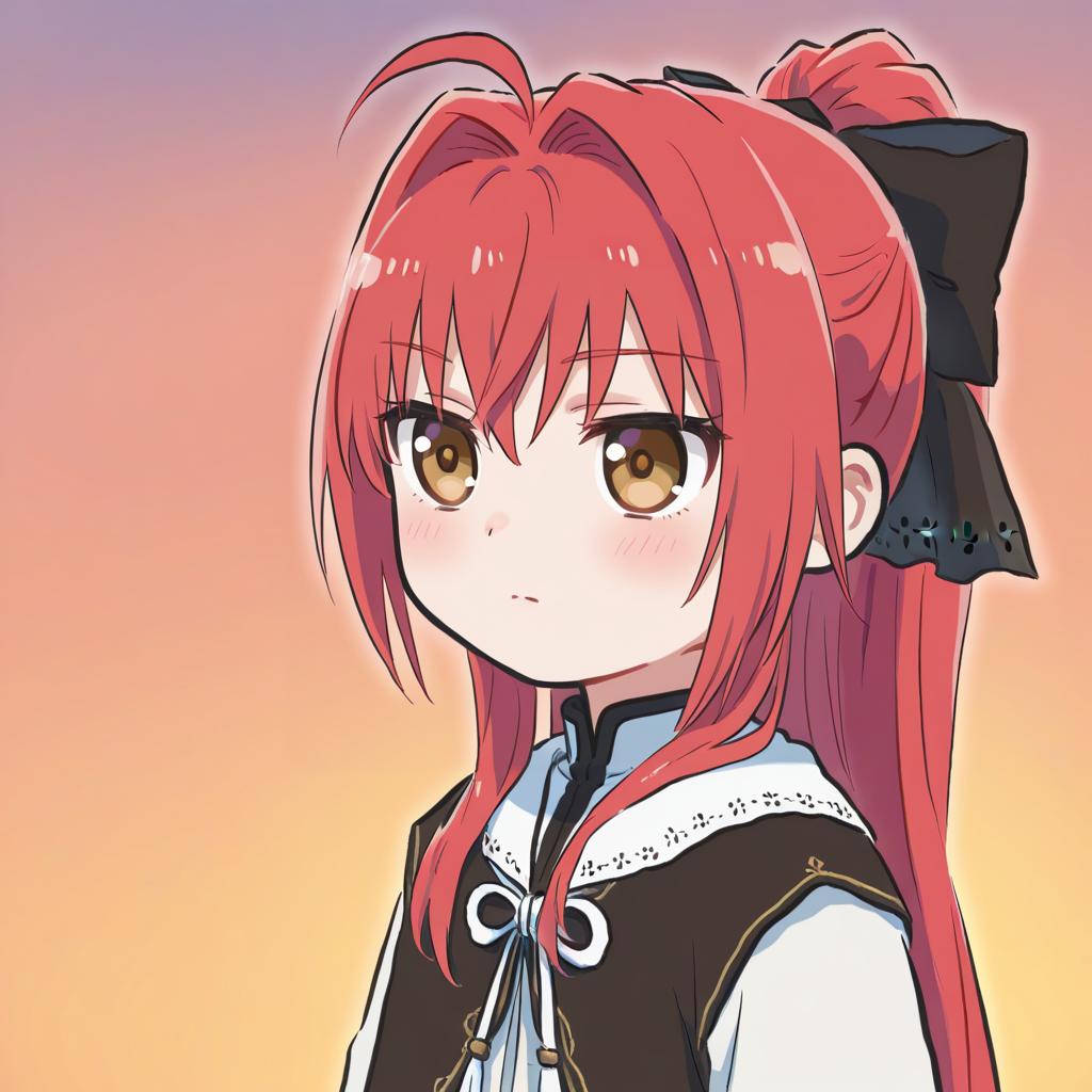 Digital illustration of an anime girl with very long red hair styled in a ponytail with an ahoge and hair intakes. She has brown eyes and a calm expression, wearing a detailed outfit with a black ribbon and white collar against a gradient background.