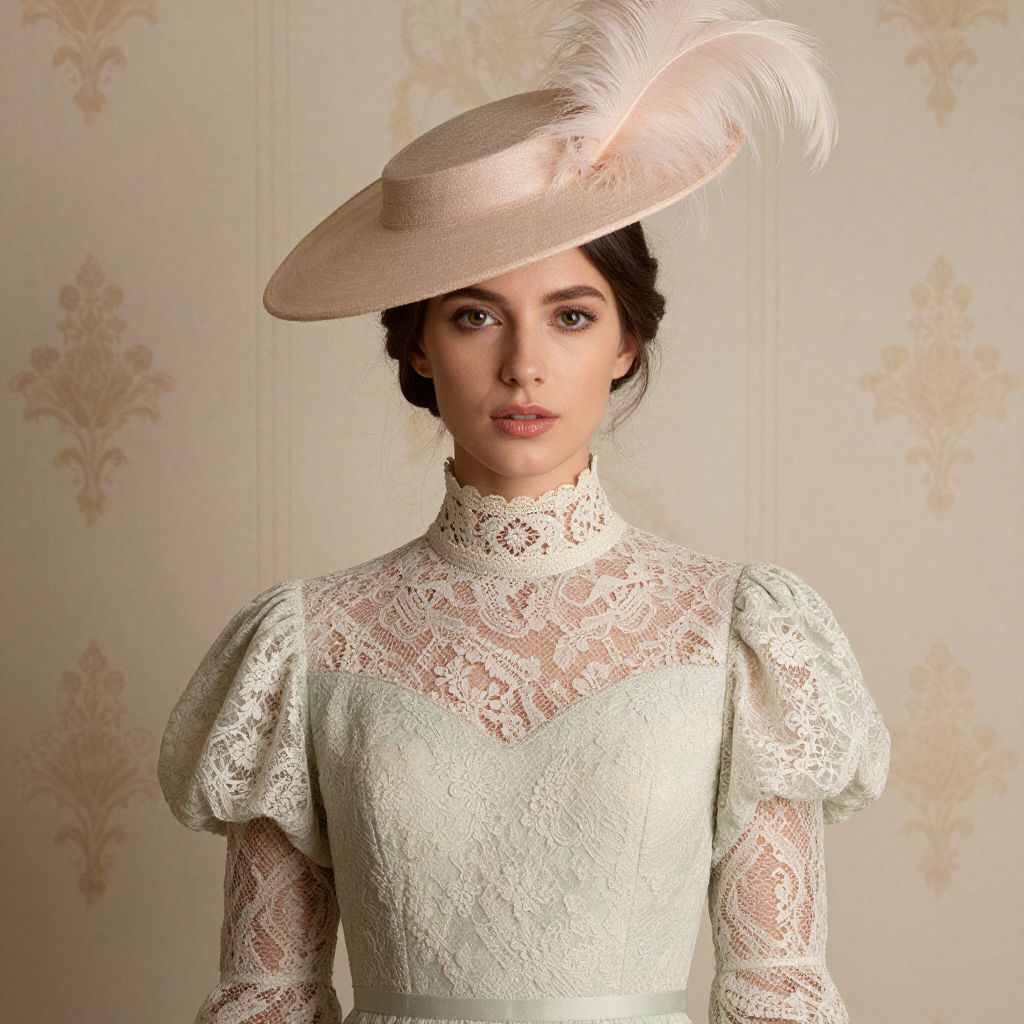 Vitoriana era fashion portrait, elegant woman in lace dress with high collar and puffed sleeves, delicate embroidery details, large feathered hat, soft pastel color palette, vintage wallpaper background, soft focus, evocative and nostalgic mood