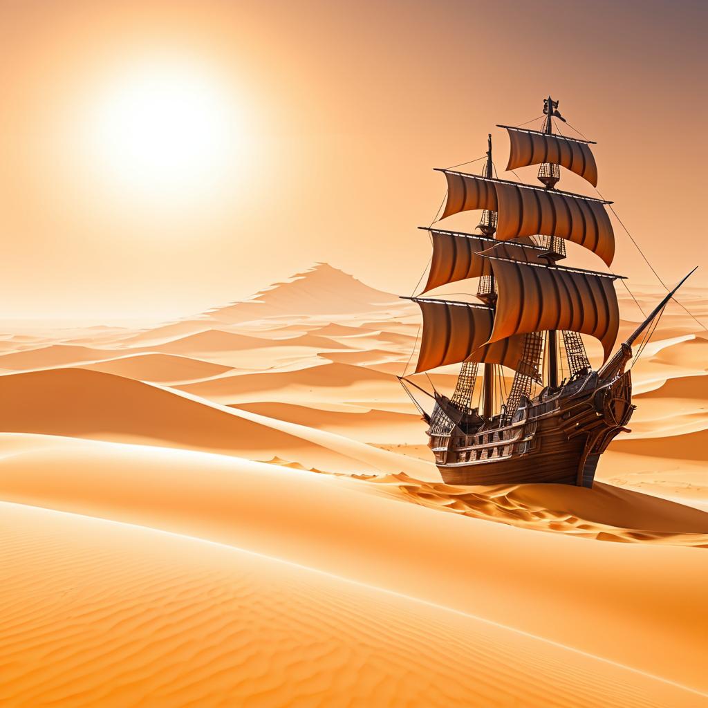 Pirate ship sailing through a vast desert with towering sand dunes and a blazing sun. Ultra-detailed concept art, trending on ArtStation, HD quality.