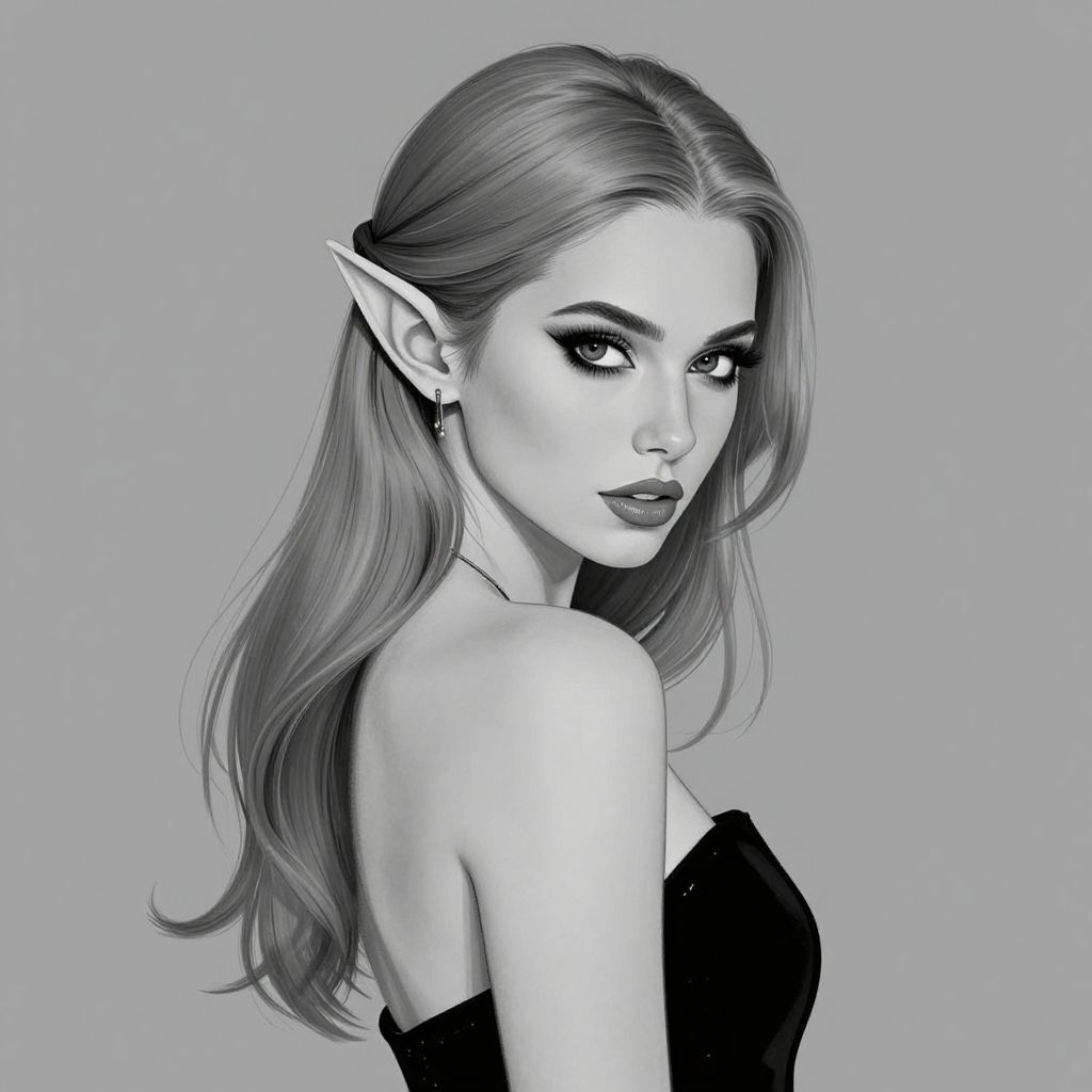Digital monochrome drawing of a beautiful elf woman with long, wavy hair, pointed ears, dark lipstick, and a strapless black top, looking