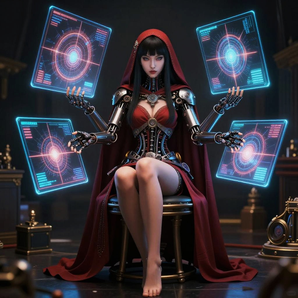 A realistic photo of a futuristic sorceress sitting on a stool in a dramatic, dimly lit setting. She wears a detailed red cloak with mechanical and electrical cybernetic arms, surrounded by glowing blue holographic interfaces. The scene combines elements of fantasy and advanced technology with vibrant colors and rich textures.