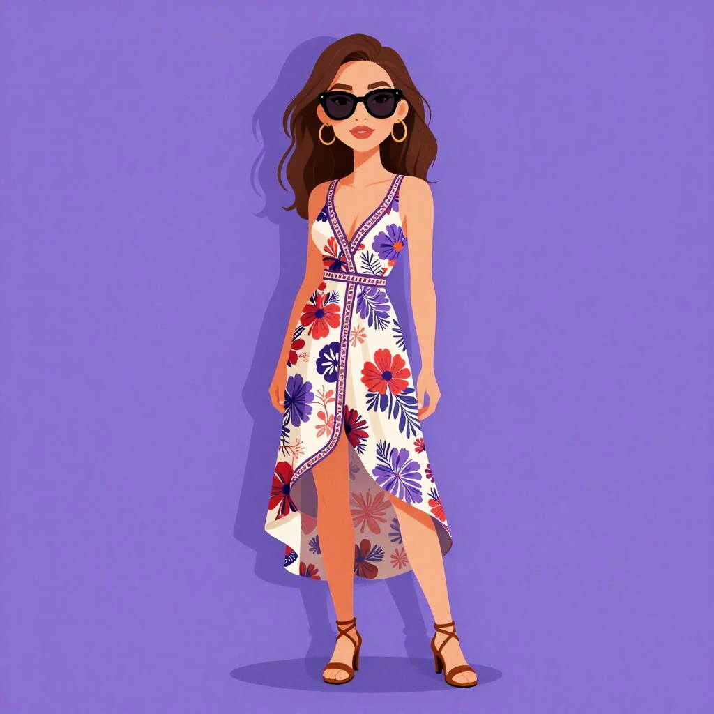 Woman with pretty face and pretty hair. Woman, summer clothing, asymmetrical handkerchief-hem dress in a blue and white tie-dye pattern, spaghetti straps, mid-calf length at longest points, black flat sandals with ankle straps, oversized transparent tote bag. --sref 1467
