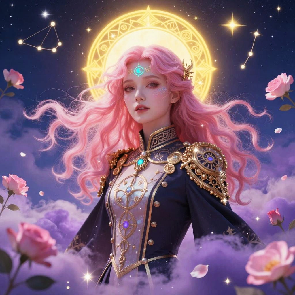 Vibrant surreal portrait of a gentle celestial spirit with flowing rose-pink hair and opal-tinted skin. The figure wears an ornate dark uniform adorned with gold accents and arcane sigils. A radiant yellow halo glows behind the head, set against a cobalt night sky filled with constellations and twinkling stars. Pink flowers and petals float among swirling violet clouds, creating a dreamy and romantic neo-classical atmosphere with pastel tones.