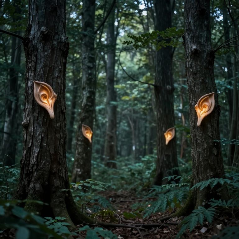 The trees whisper secrets to each other in a forest where every leaf is a tiny, glowing ear shaped to heard ancient spells.