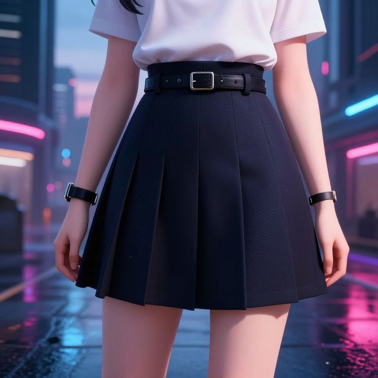 Digital art of a woman in a white top and black pleated skirt, wearing a belt and wristwatch, standing on a neon-lit, rain