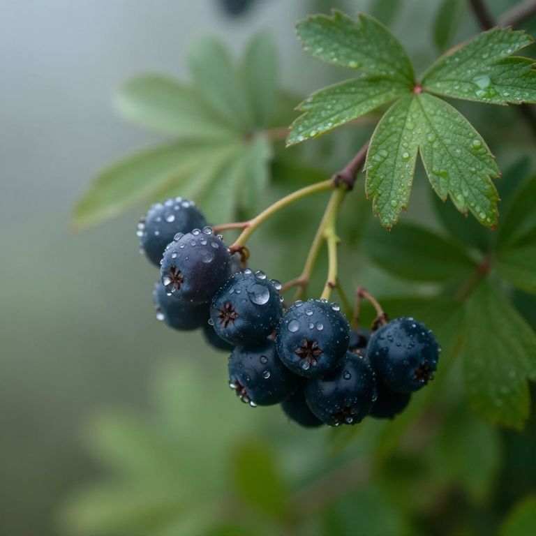 Close-up of tollkirsche berries with dewy drops reflecting early morning light, surrounded by lush green leaves, subtle fog adding a mysterious touch, high detail, realistic botanical art with a hint of fantasy