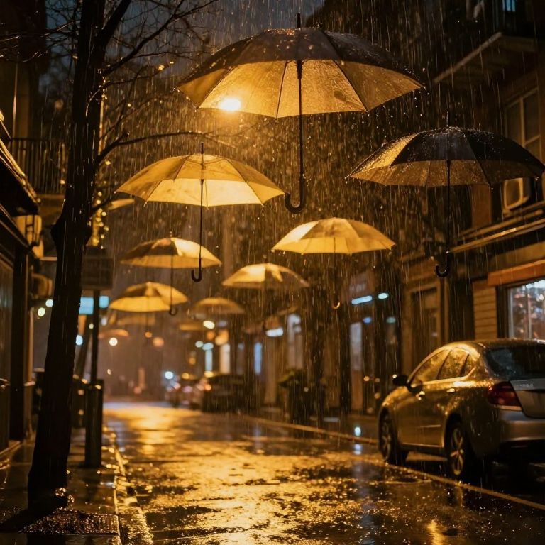 Photograph of a rainy urban street at night, illuminated by warm yellow streetlights. Multiple transparent umbrellas hang from overhead, casting a glowing light on the wet pavement. Raindrops are visible, creating a shimmering effect on the street. A parked silver car is on the right, with blurred headlights and streetlights in the background. Buildings with lit windows line both sides, adding to the cozy, moody atmosphere. The scene is vibrant with contrasting warm and cool tones, highlighting the urban setting and rainy weather.