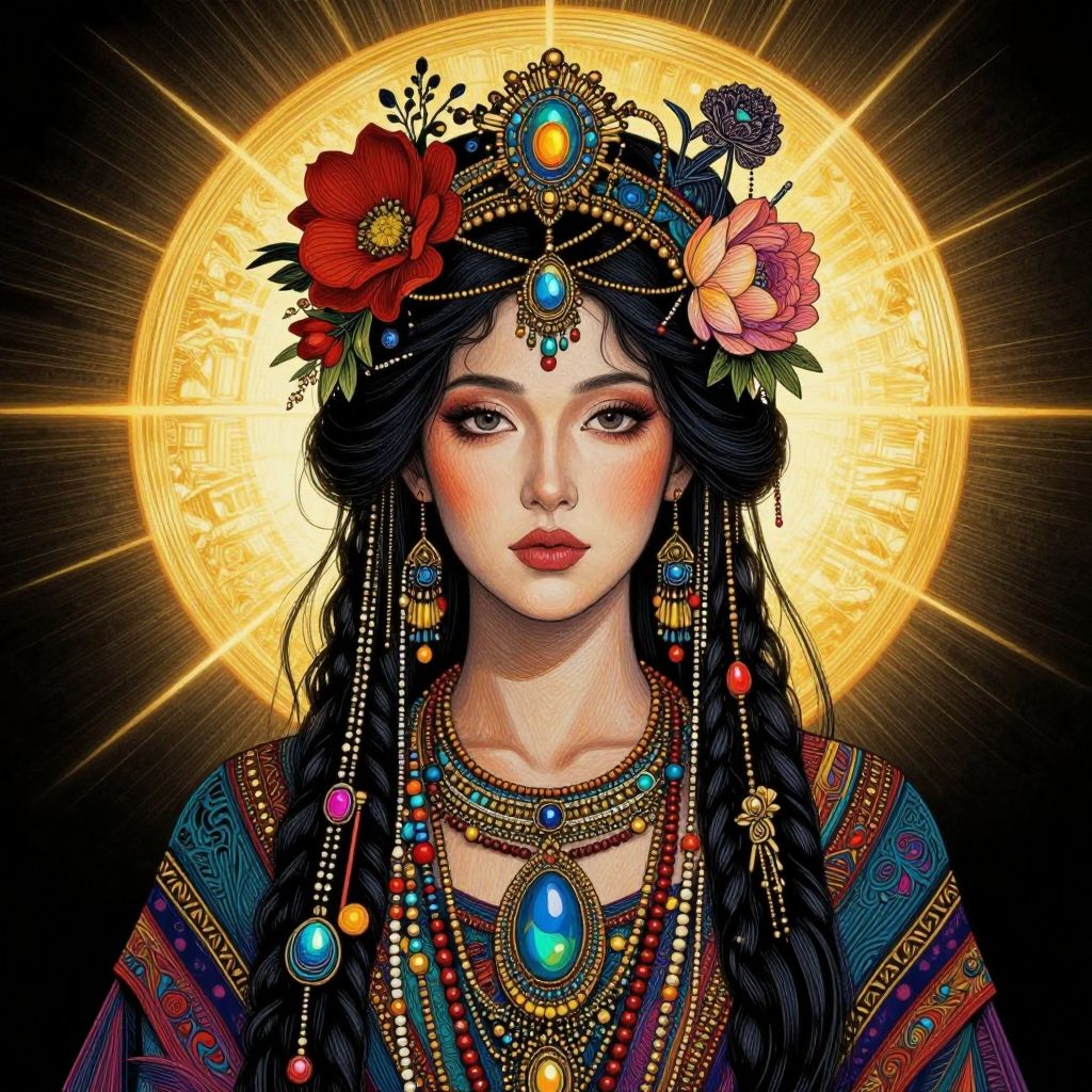 Digital illustration of a fair-skinned woman with long black hair adorned with a floral headpiece featuring red, pink, and purple flowers. She wears an elaborate set of colorful, bejeweled necklaces and earrings, with blue and turquoise gemstones prominent. Her dark eyes are accented with subtle makeup, and her lips are painted a soft red. The background is a radiant, golden circular halo with sunburst rays. Her traditional, embroidered garment features vibrant patterns in blue, red, and gold. The overall style is highly detailed and vibrant, with a mix of traditional and fantastical elements.