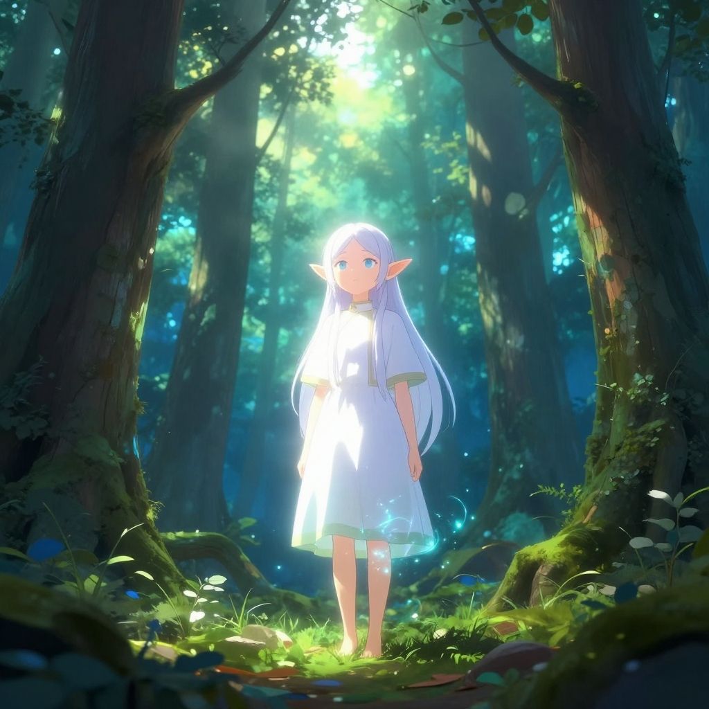 Frieren elves standing in an ancient forest, ethereal light filtering through towering trees, delicate features glowing with magical aura, mystical fantasy art style, vibrant colors