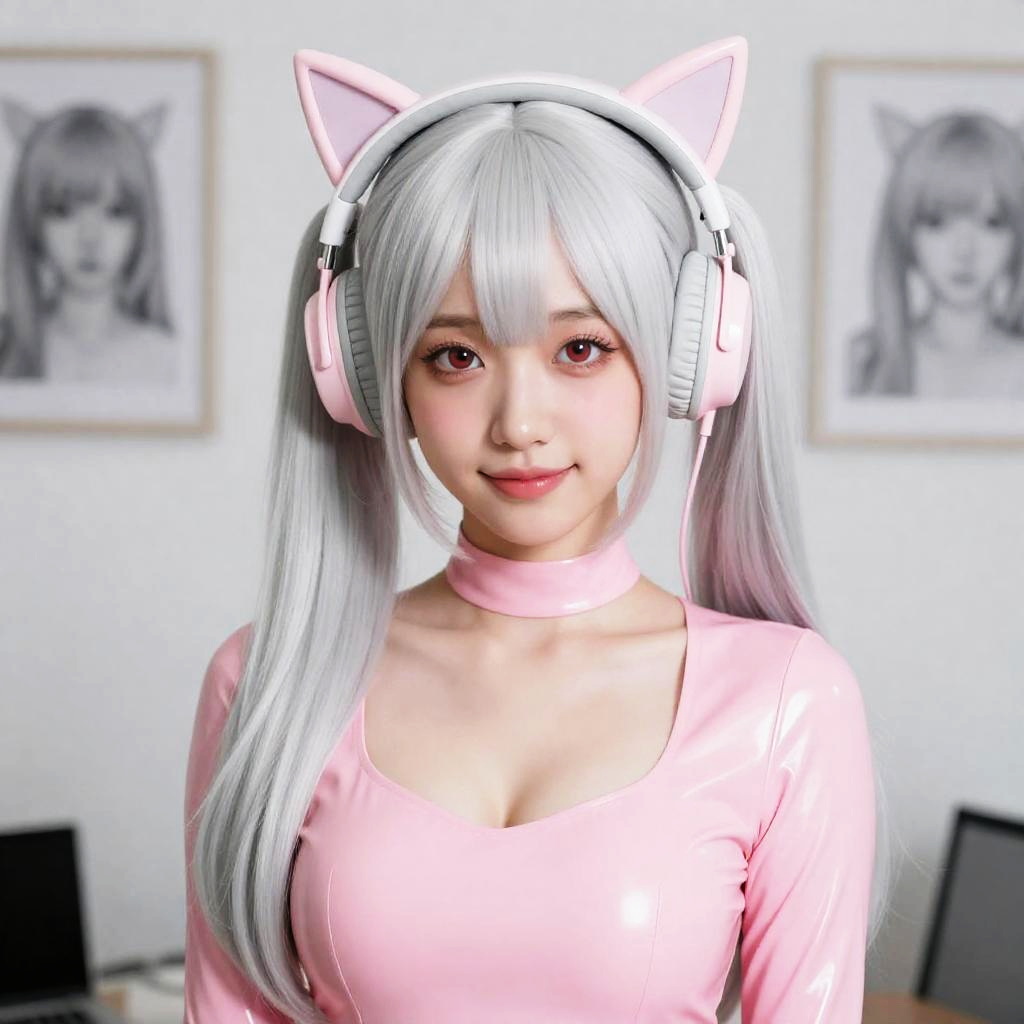 Best quality, ultra high res, (photorealistic:1.4), masterpiece, 1girl, Kpop idol, (aegyo sal:1.0), puffy eyes, (City of Minimal), alice \(nikke\), (pink bodysuit), ((animal ear headphones)), (shiny clothes), twintails, (latex bodysuit), (rubber suit), bust body, Smooth clothesя╝МSimple backgroundя╝М(Slight cleavage), (slender), ((white hair)), (silver hair), (gray hair), ((red pupil)), (looking at viewer), (smile), Happy, (long hair), nsfw, depth of field, detail face, shiny skin, nice detailed eyes, heavy eye makeup, slim waist, blush, detailed eye makeup, perfect anatomyя╝МComb hair back(pureerosface_v1:0.55), paintings, sketches, (worst quality:2), (low quality:2), (normal quality:2), lowres, normal quality, ((monochrome)), ((grayscale)), skin spots, acnes, skin blemishes, age spot, glans, extra fingers, fewer fingers, strange fingers, bad hand, bad leg, multi leg, missing clit, bad clit, nipple, fusion crotch, bad Drawn crotch, bra, logo, sign, Messy hairя╝МChest hairя╝МFragmentary hairSteps: 26, Sampler: DPM++ 2M Karras, CFG scale: 7, Seed: 920455021, Size: 500x750, Model hash: fc2511737a, Model: chilloutmix_NiPrunedFp32Fix, Denoising strength: 0.4, ENSD: 31337, Hires upscale: 1.6, Hires steps: 20, Hires upscaler: ESRGAN_4x