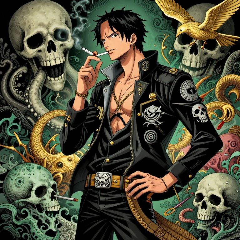 Anime-style digital artwork of a smirking, black-haired man in an open black jacket, surrounded by skulls, serpents, and a golden