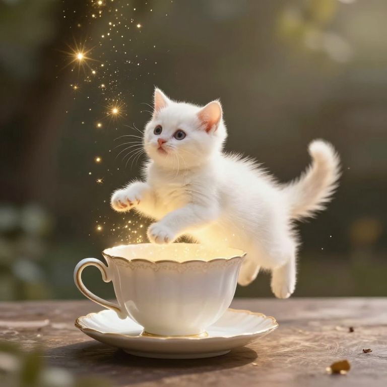 In a realm where wonder defies gravity, a luminous kitten leaps into the ethereal embrace of a teacup, igniting a cascade of golden sparks that dance like whispers of freedom and magic, while the air hums with the warmth of possibility and the promise of boundless dreams.