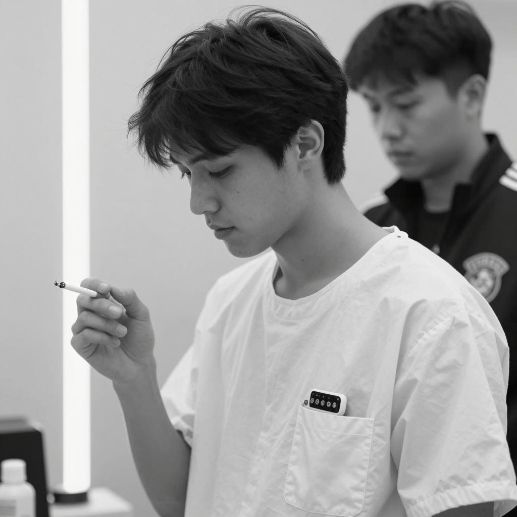 Black and white photograph of a young man with dark, straight hair wearing a white hospital gown, holding a cigarette in his right hand, and a small device with buttons on his left chest. Another man with dark hair and a sports jacket is partially visible in the background. Bright vertical light on the left.