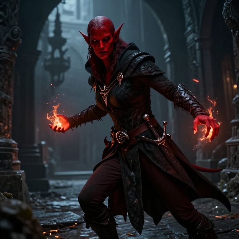 Tiefling rogue moving stealthily through a shadowy medieval city, crimson skin and sharp tail evident, cloaked in dark fabrics with intricate dagger at belt, glowing embers around her hands, cinematic lighting, fantasy art style, atmospheric