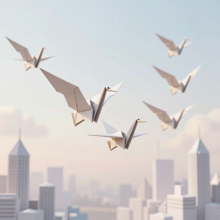 A mesmerizing 3D-rendered scene depicts an armada of intricately designed origami cranes soaring in harmonious formations against a soft, ethereal sky, their delicate wings rhythmically folding and unfolding as they glide over a surreal landscape of floating paper cities, evoking a dreamlike, high-definition blend of minimalism and fantasy.