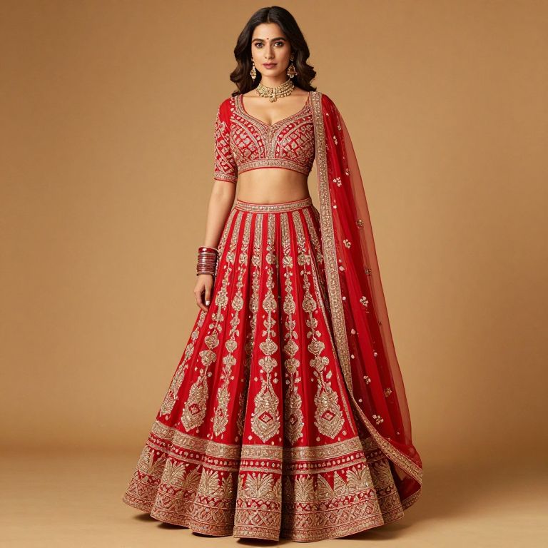 Photograph of a woman in a red traditional Indian lehenga set with gold embroidery, cropped top, and choker, standing against a beige background.
