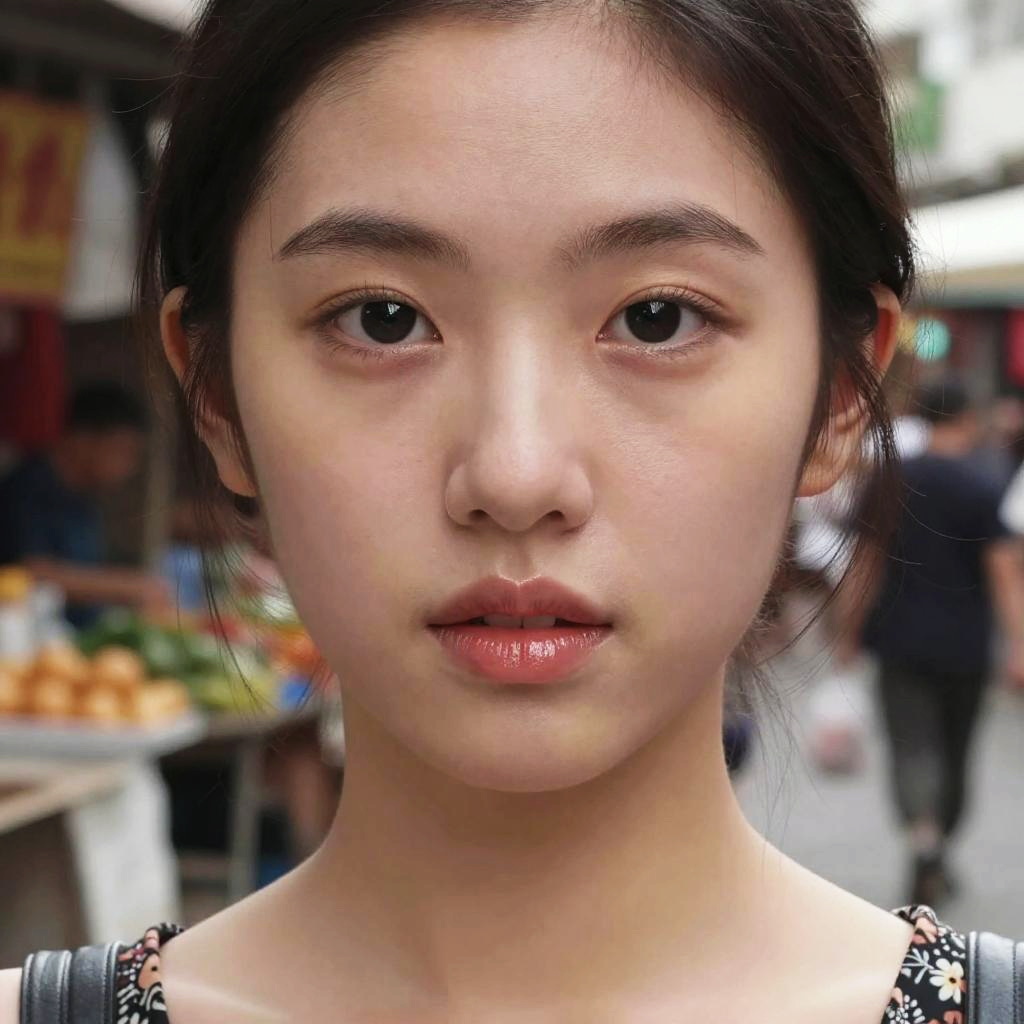 Solo, 1girl, blurry, blurry background, realistic, shirt, long hair, closed eyes, upper body, brown hair, outdoors, short sleeves, closed mouth, lips, grey shirt, day, depth of field, tree, black hair, collarbone, nature, asian, t-shirt, forehead