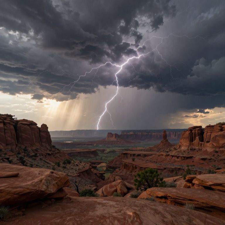 Photograph of a dramatic lightning strike over a vast, rugged desert landscape with red rock formations, dark storm clouds, and bright sunlight breaking through.