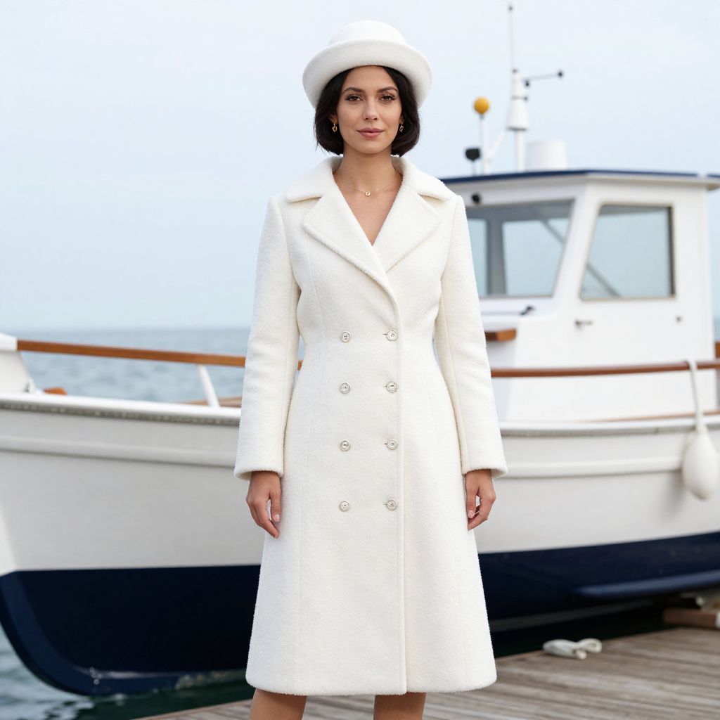 Snow White Costume Deluxe, woman in a white coat and hat standing in front of a boat