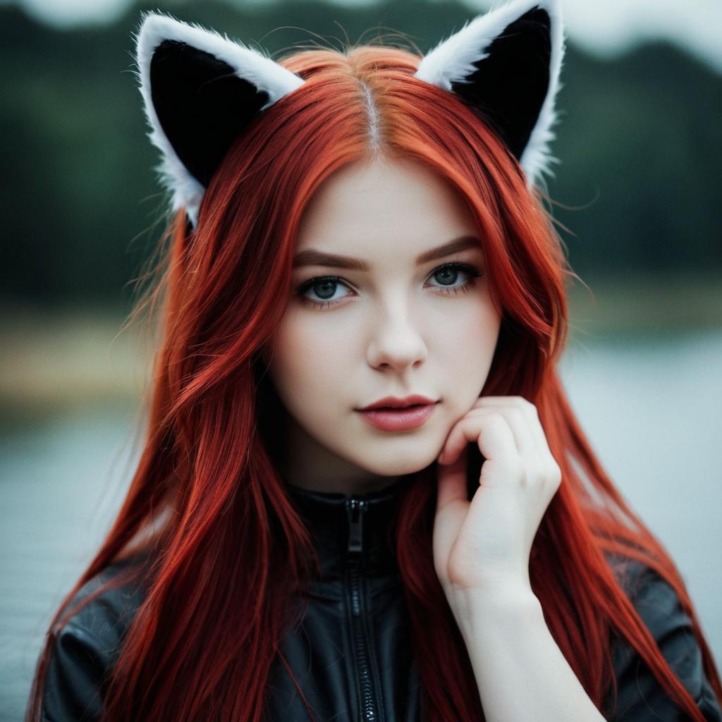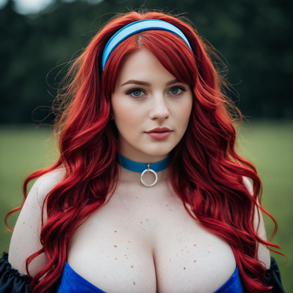 Portrait of a young woman with vibrant red hair and blue eyes wearing a blue bodysuit costume inspired by Rena Rouge. She has blue furry cat ears headband and light freckles on her face and chest. The background is blurred, emphasizing her focused gaze and detailed costume features including cleavage cutout.