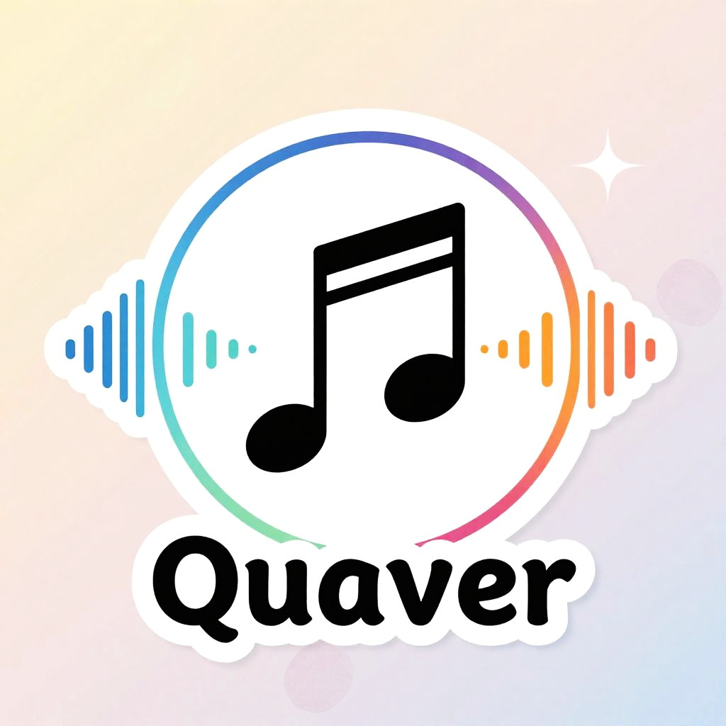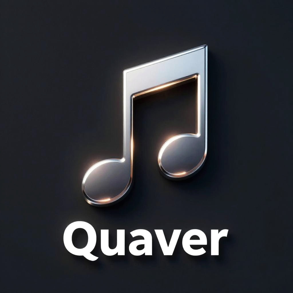 Digital logo featuring a shiny, metallic eighth note on a dark blue background with the word "Quaver" in bold white letters below.