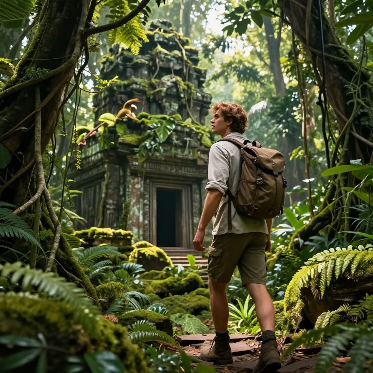 Zachs as a heroic explorer in a lush jungle, ancient ruins covered in vines and moss, beams of sunlight breaking through dense foliage, detailed textures of leaves and wildlife, the character equipped with adventure gear, evoking a sense of discovery and mystery.