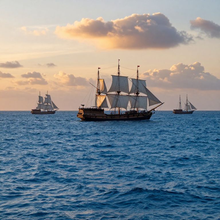 Photograph of three historic sailing ships with white sails on a vibrant blue ocean at sunset, under a sky with golden clouds.