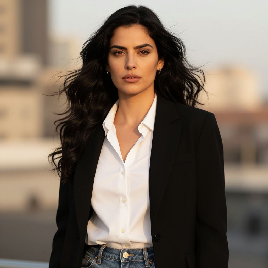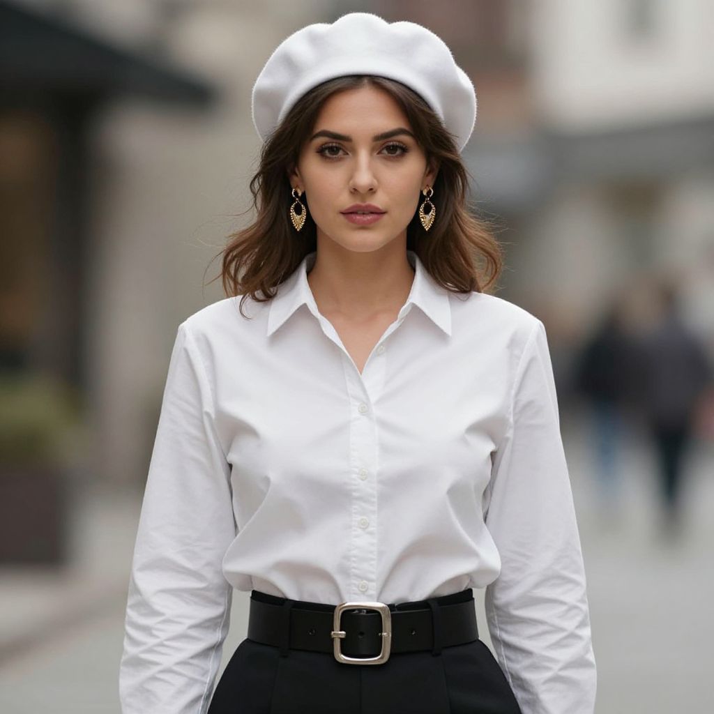 Photograph of a confident woman standing in front of a dark wooden door in a beige building. She has medium-length brown hair and a serious expression. She's wearing a crisp white button-up shirt with the sleeves rolled up and high-waisted white jeans. The shirt is slightly tucked into the jeans, and she's accessorized with small gold hoop earrings. The lighting is natural, highlighting her outfit against the contrasting door and building.