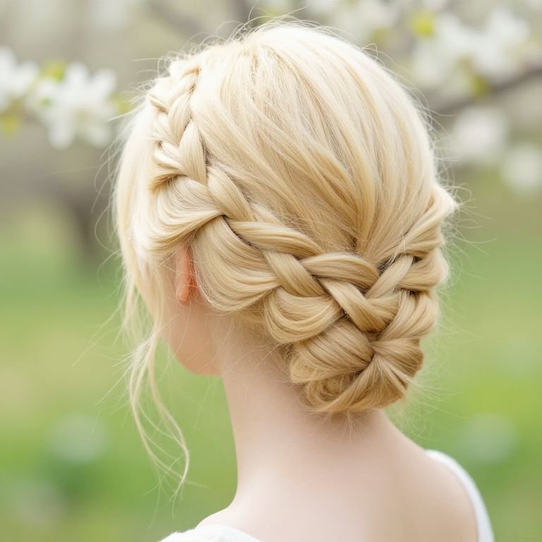 Try blonde hair braided into an intricate crown braid, illuminated by soft natural light, fresh spring garden background, ethereal and graceful theme, pastel colors palette, fine details, dreamy and romantic style imagery