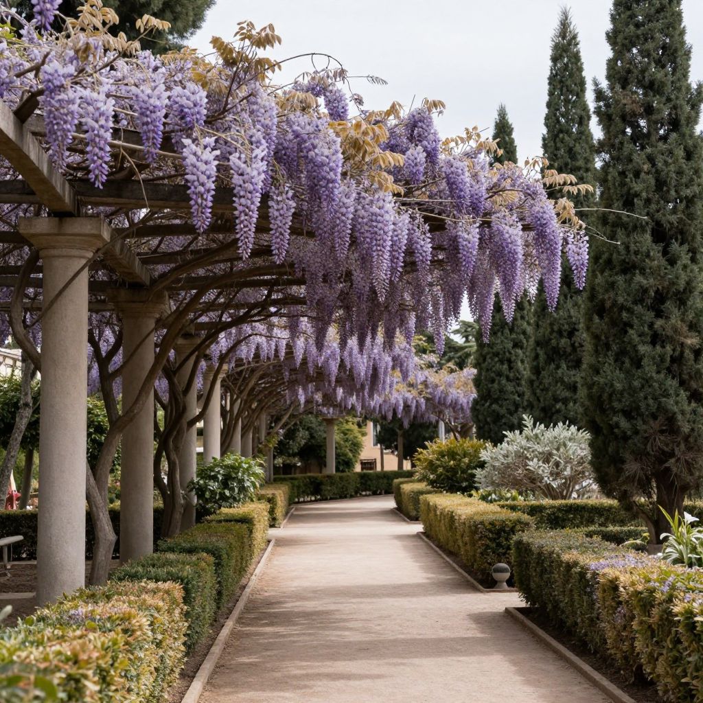 Lavender-colored wisteria sinensis cascades elegantly over a grand pergola, creating a stunning canopy that stretches along a meticulously manicured pathway lined with symmetrical hedges and tall evergreen trees, set within the serene ambiance of Malaga's botanical garden.