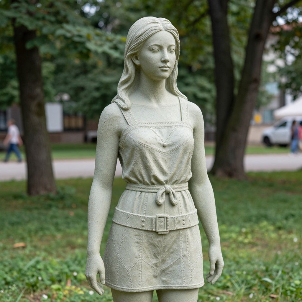 Photograph of a lifelike, pale green, stone-like statue of a young woman with long hair, wearing a sleeveless dress and belt,