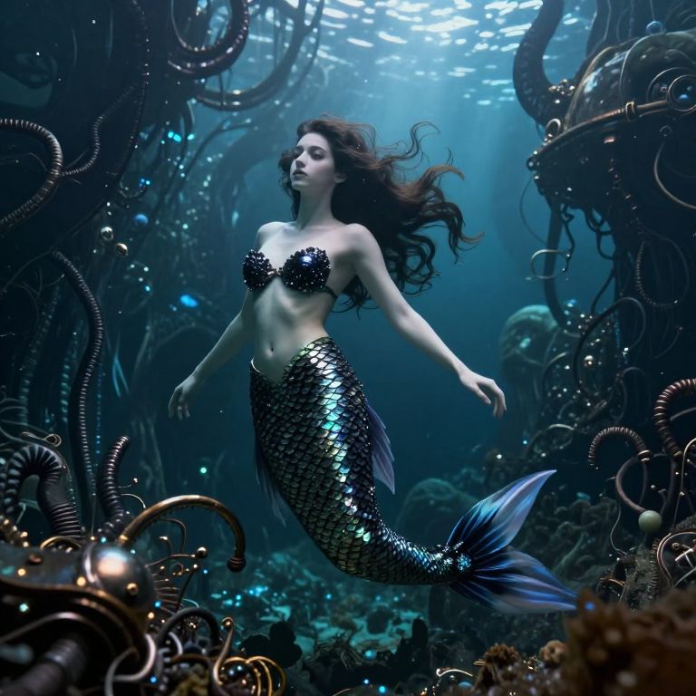 A surreal portrait depicting an astronaut mermaid suspended mid-flight in a cosmic ocean, her sleek spacesuit adorned with iridescent scales shimmering under starlight. A glowing nebula serves as her hairstyle, and her vibrant, alien eyes reflect distant galaxies, captivating the viewer's gaze. The overhead perspective offers a dramatic gradient of emotions ranging from awe to curiosity, as this fantastical creature navigates between Earth and space, artfully blending elements of fantasy and reality in a dreamlike scenario reminiscent of Dali's iconic works.