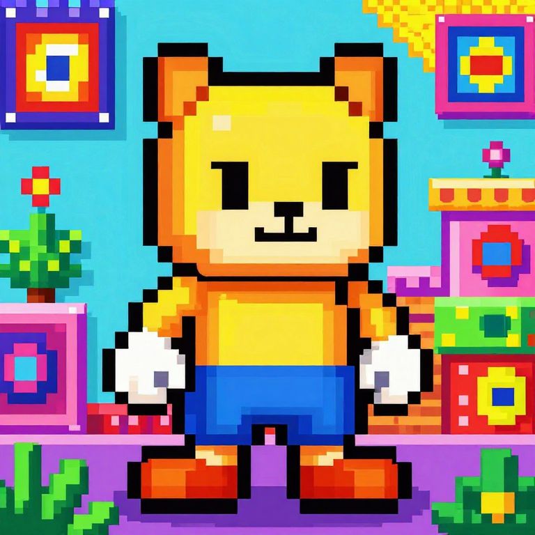 Convert art to pixel art style, vibrant colors with detailed pixel-by-pixel shading, retro 8-bit video game aesthetic, nostalgic and playful mood, sharp and crisp edges, classic pixelated character and background design blending modern art elements
