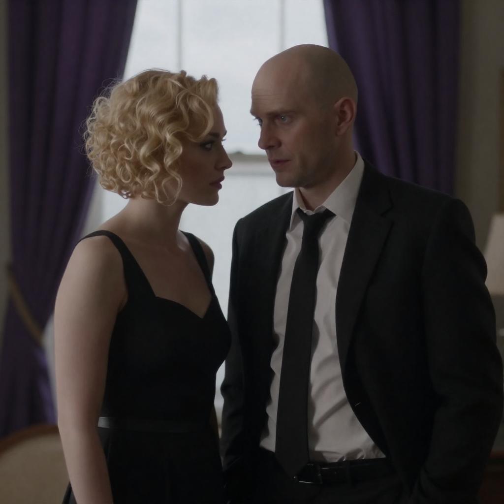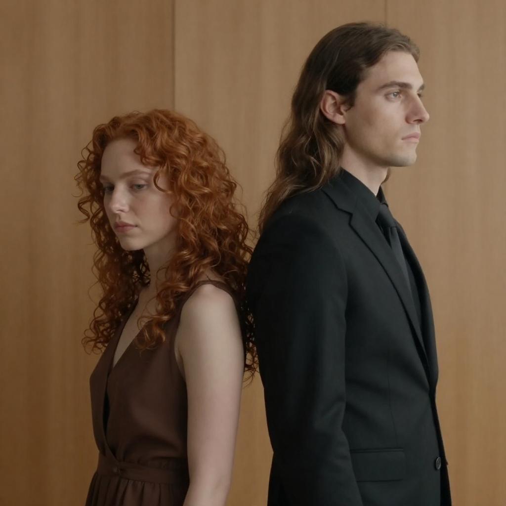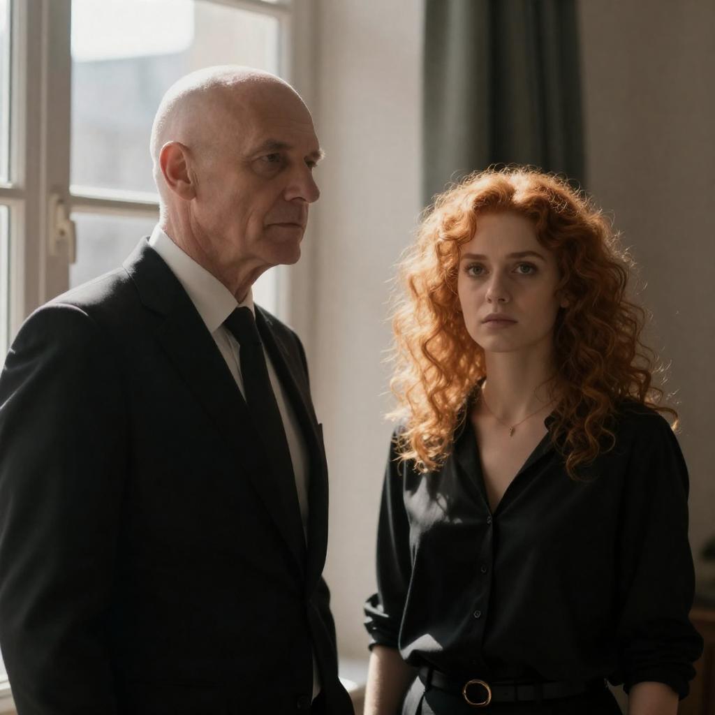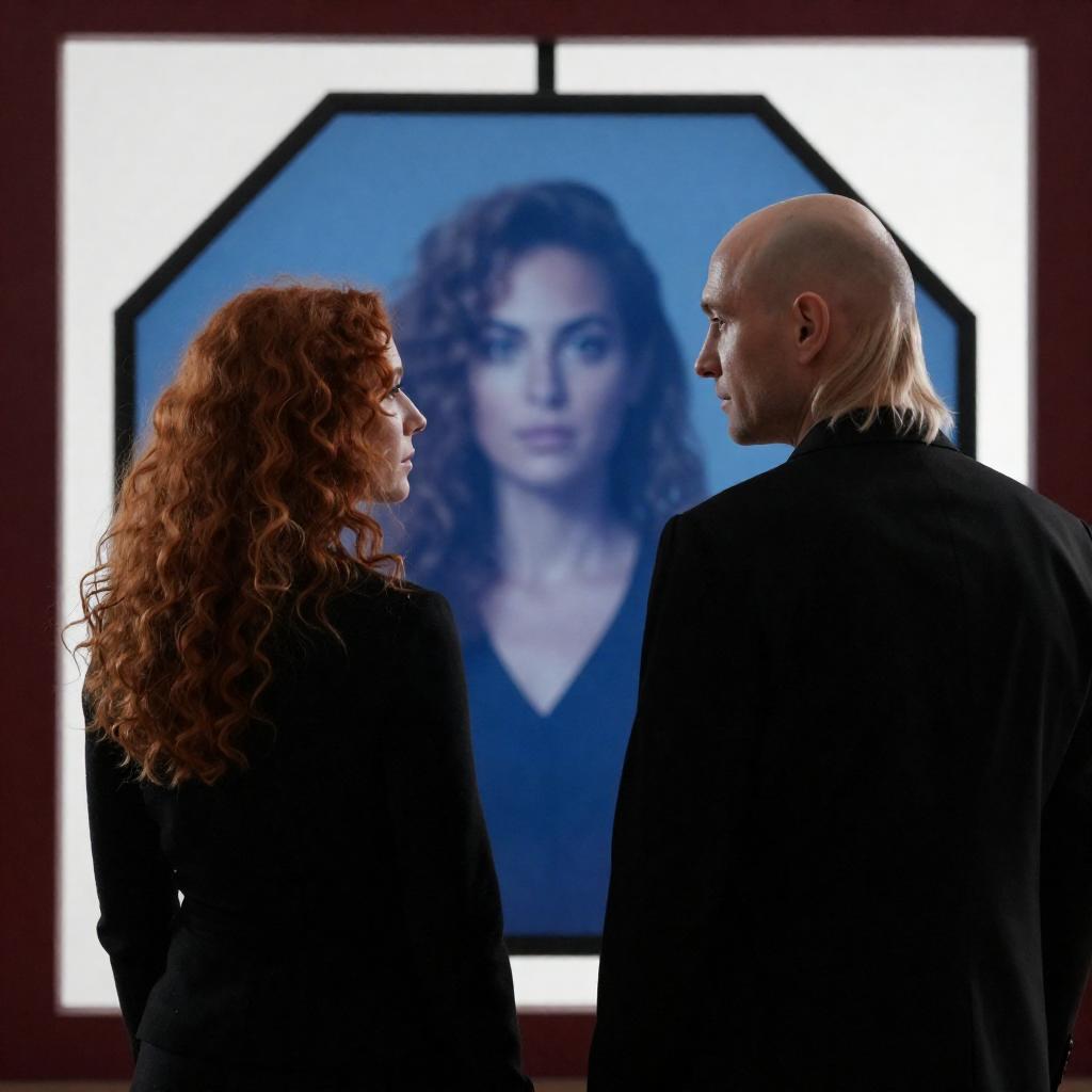 Photograph of two people facing an octagonal blue screen. The woman on the left has curly red hair, the man on the right has bald with long blonde hair, both in black clothing. The screen shows a blurry blue image of a woman with curly hair. Red frame around the screen, natural light from behind. Intense focus on screen.