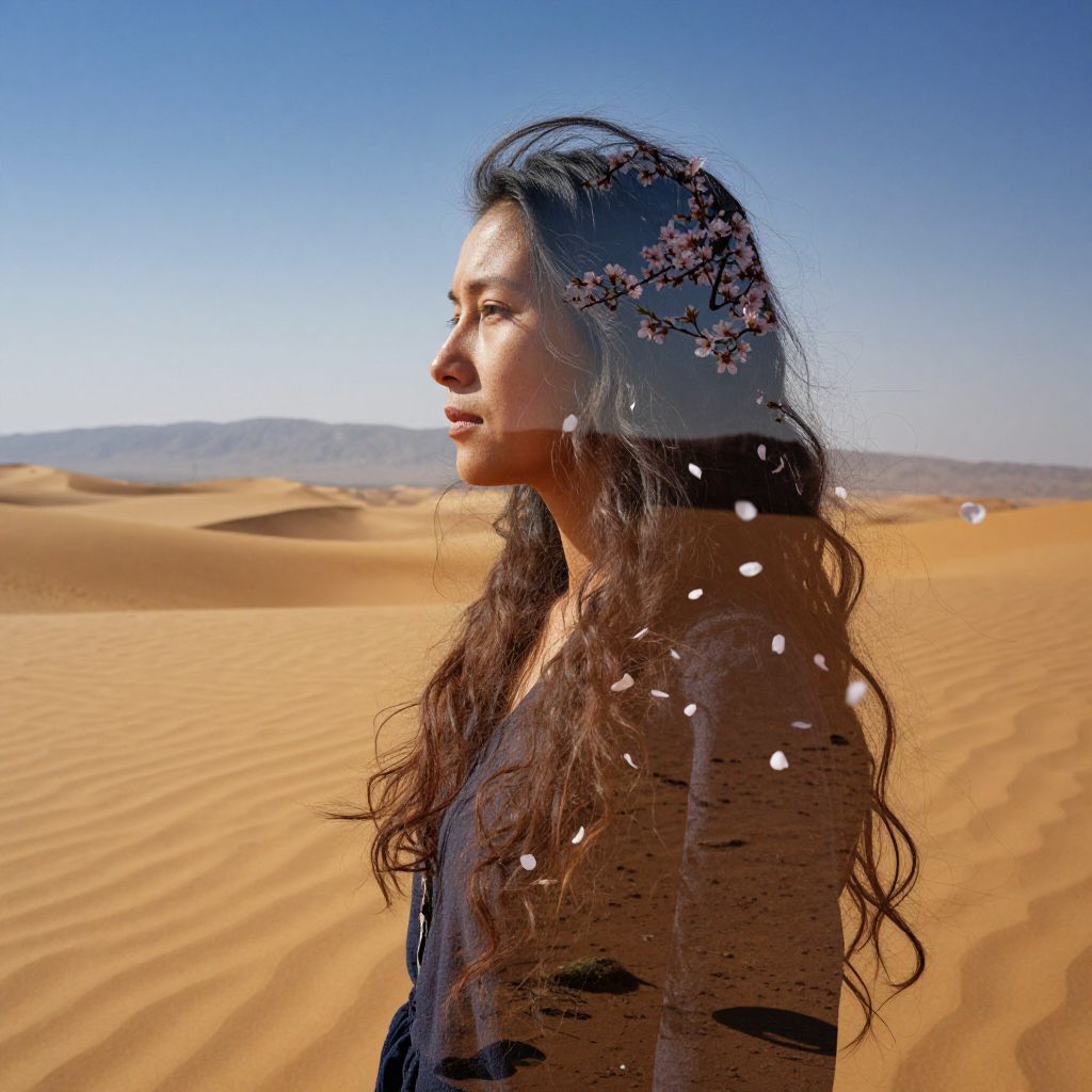 Create an evocative double exposure portrait of a solitary woman in her mid-thirties standing at the desert's edge, with golden sands stretching towards distant mountains. Her long, wavy hair and weathered face, marked by life's experiences, stand silhouetted against a vivid sky. Delicate cherry blossom petals overlay this scene, gently fluttering to the ground and seamlessly merging into her hair, symbolizing a metamorphosis between nature and human essence. The interplay of light and shadow across both layers is accentuated by the lighting, creating a mesmerizing texture where the desert's roughness meets the softness of blooming petals. This portrait should evoke a profound sense of solitude and transience amidst natural grandeur, inviting contemplation on life's fleeting nature.