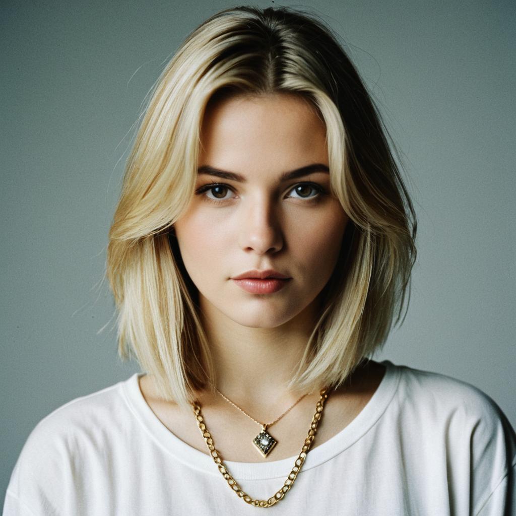 Medium length haircut fine,1girl, solo, jewelry, necklace, long hair, blonde hair, realistic, looking at viewer, lips, shirt, upper body