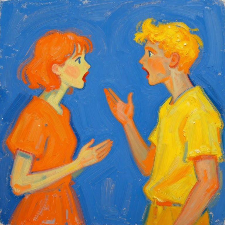 Two individuals engage in a heated discussion, their words manifesting as vibrant, impressionistic brushstrokes of orange and yellow against a contrasting blue background, creating a dynamic and expressive visual dialogue reminiscent of a living, evolving painting.