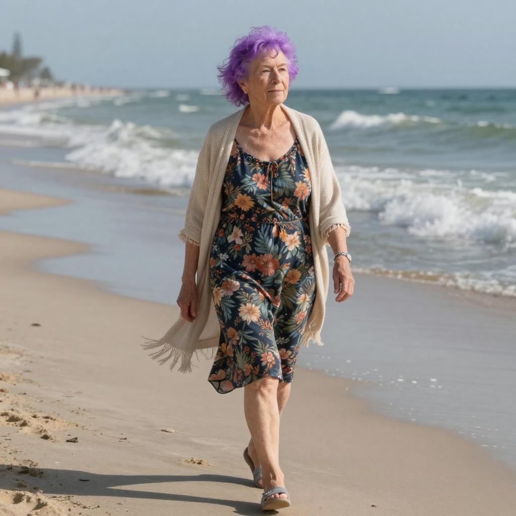 Photograph of an elderly woman with purple hair, wearing a floral dress and beige cardigan, walking on a sunny beach with gentle waves in the background