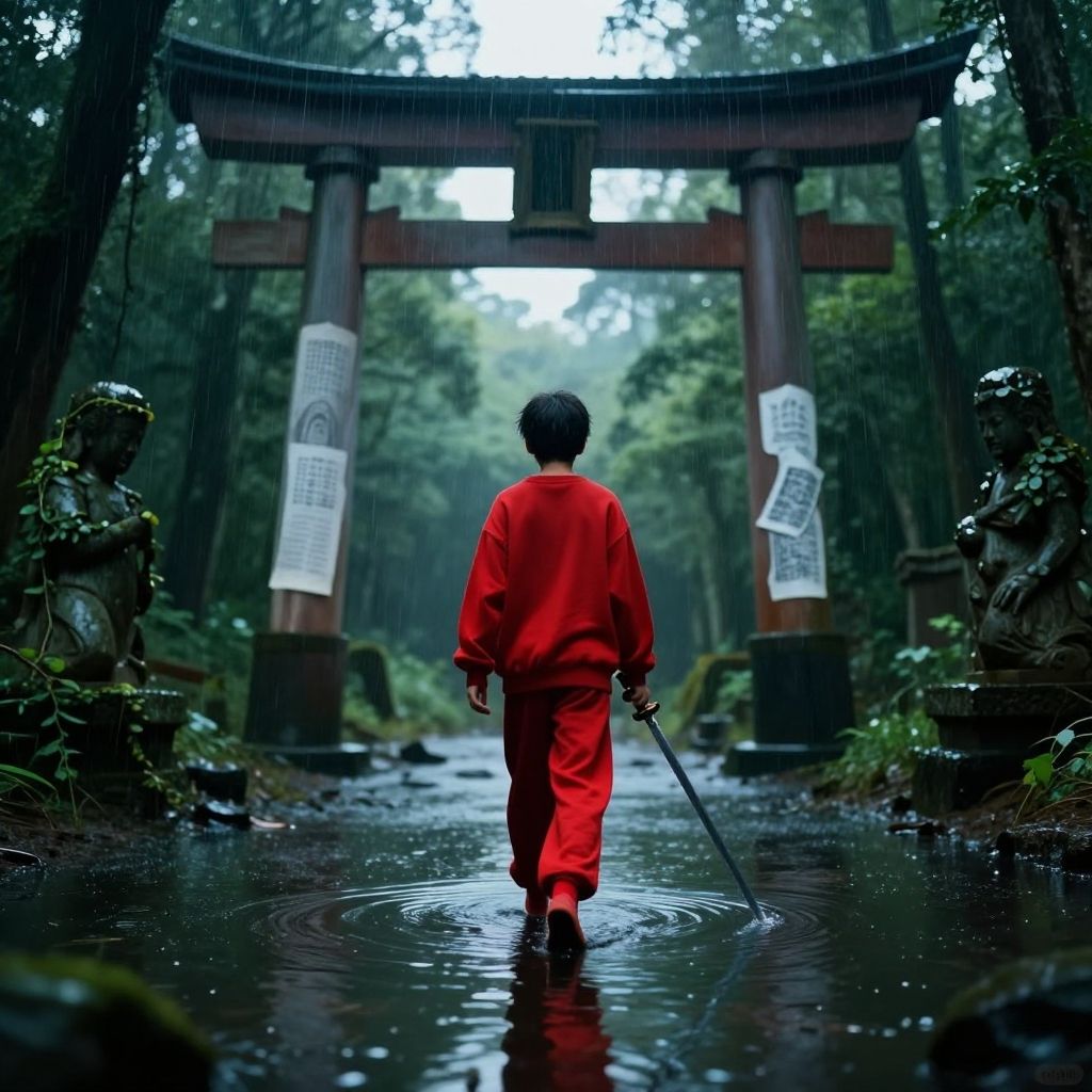 A photograph of a person with short black hair, seen from behind, walking through a rain-soaked forest path. The individual is wearing a bright red robe and holding a black sword in their right hand. The path is reflective from the rain, leading to a large, traditional Japanese torii gate with two vertical paper signs hanging on either side. The forest is lush and green, with trees on either side. The overall mood is mystical and serene, with the vibrant red of the robe contrasting sharply with the dark, wet surroundings.