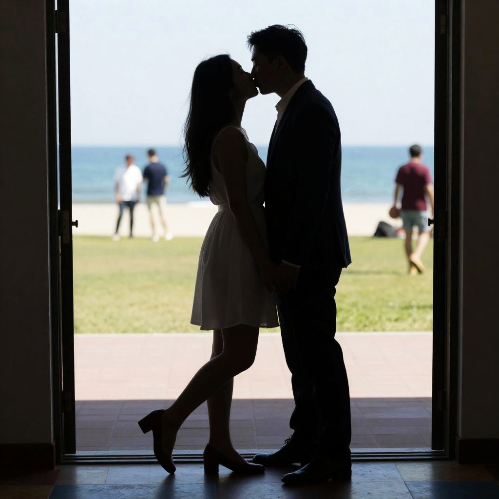 Silhouette of a man and woman kissing in an open arched doorway. The woman is wearing a knee-length dress and heels, the man is dressed in a dark suit. Bright daylight illuminates the ocean in the background with people walking and sitting on the beach. The interior is dark with two lamps on either side of the doorway.